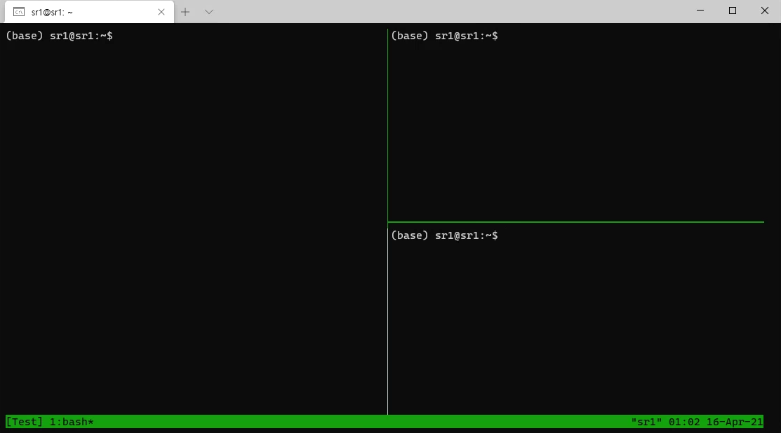 이번엔 우측 pane이 아래, 위로 쪼개지며 총 세 개의 터미널이 생겼다. 이런 식으로 원하는 대로 window 내 pane을 늘려가면 된다. 여러 터미널 output을 동시에 봐야 할 때 유용하다. (프로세스 진행 상황을 보면서 htop, nvidia-smi를 모니터링 한다던지)