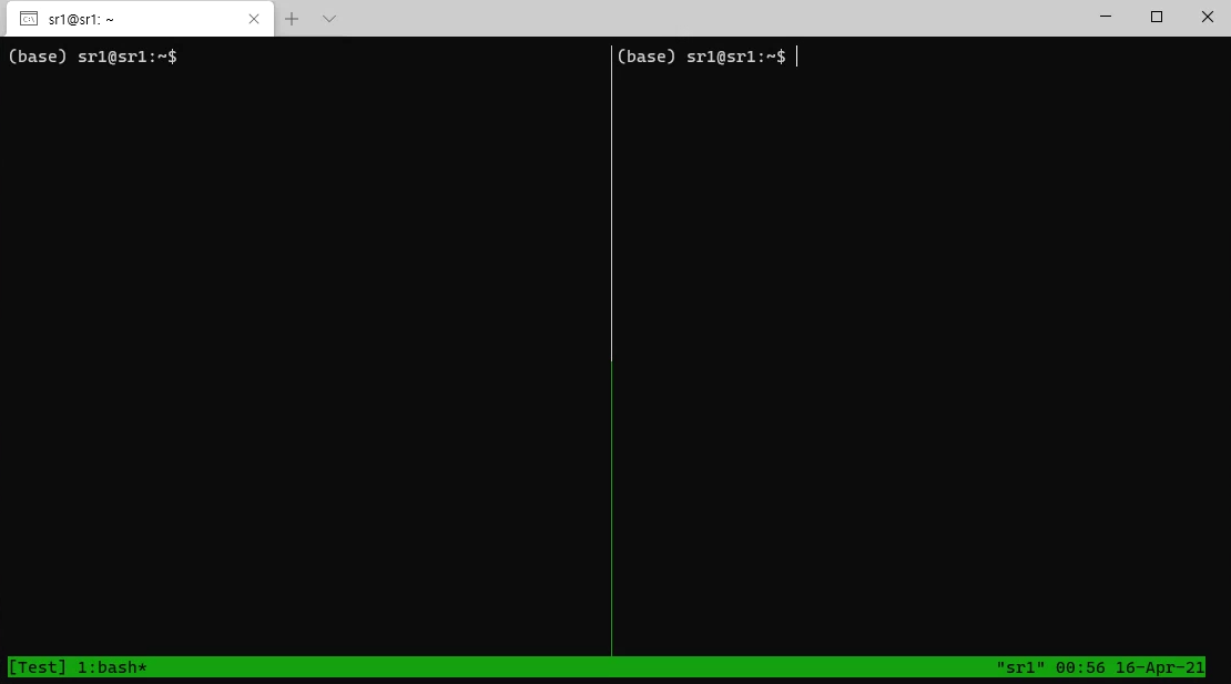 기존의 단일 pane이 양 쪽으로 나눠지며, 총 두 개의 터미널이 생성되었다. 입력 가능한 pane은 자동으로 새 pane 쪽으로 지정된다. 이 상태에서 아래 커맨드까지 적용하면 어떻게 될까?
