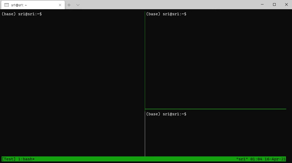 마지막으로, 터미널 하나하나를 담당하는 pane 관련 기능을 알아보자. 기본적으로 처음 window를 생성하면 하나의 pane만을 (터미널 하나) 생성해 주는데, 이 pane 영역을 한 화면 내에서 잘게 쪼개는 식으로 window 하나 당 터미널 갯수를 늘려줄 수 있다. 아래에서 여러 커맨드와 함께 어떤 느낌인지 알아보자.